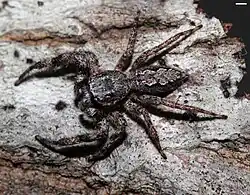 Tan jumping spiders can be identified by their mottled tan coloration, thin bodies and chevron patterning on their abdomens. The tan jumping spider's thin body allows them to hide themselves under the loosened bark of trees and in other tight places. The prominent chevron-like pattern on their abdomens serves to break up their visual profile and make them more difficult to distinguish on mottled surfaces.[3][2]