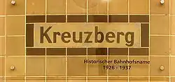 The station opened on 14 February 1926 and was then called Kreuzberg (after the hill which gives the district its name; it is on the edge of the district).[5] Two old wall signs with that name, uncovered in renovation, have been preserved under glass. It was the terminus of Line CII (today U6) until the opening of Paradestraße station on 10 September 1927. The latter was originally called Flughafen (Airport). However, in 1937 that station received its current name and the Kreuzberg station was renamed Flughafen.[1] It had a direct connection to Tempelhof Airport, at that time unique in the world;[6] it remained the connection between the airport and the city's public transport system until the airport closed in October 2008.