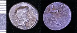 - Aulus Plautius, tribune of the plebs in 56 BC, curule aedile in 55, praetor urbanus in 51, and subsequently propraetor of Bithynia and Pontus. He was a friend of Cicero and supported Pompey. He also minted coins during his aedileship.[52][53][54]