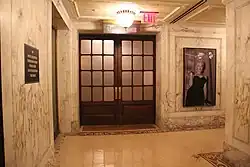 In 1929, Warren and Wetmore's ballroom was reconstructed according to a neoclassical design by Schultze & Weaver.[32][106] The room has a white-and-cream color scheme with gold ornamentation, evocative of the original ballroom's design.[52][107] The stage remains on the western wall, but is within a rounded opening. The redesign added audience boxes, with decorative metal railings, on the north and east walls.[108][109] The ballroom contains a coved ceiling with roundels, lunettes, bas reliefs, and two chandeliers.[108] South of the ballroom proper is a corridor running west to east.[105][68] The corridor has a decorative barrel-vaulted paneled ceiling and had a balcony that was removed during the 1929 redesign.[110] On the southernmost section of floor 1 is the ballroom foyer and the stair hall, two formerly separate rooms that were combined in 1965 to form a neoclassical marble-clad space. The stair hall contains the stairs leading from the mezzanine foyer.[111][112]