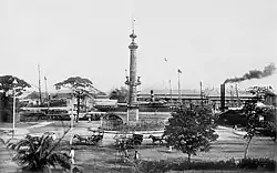 Until 1904, the area of Plaza Mexico contained the walls of the Baluarte de Santo Domingo, which enclosed the Aduana Building and the old Santo Domingo Church. That year, the American colonial government, seeing the need to develop and expand the Pasig River docks, decided to tear down its walls and open up this side of Intramuros. The Magallanes Monument, originally erected in 1848 in the centre of the esplanade called Paseo de Magallanes to honour the Portuguese navigator who had arrived on the country's islands while in search of the Maluku Islands, was transferred to this site fronting the Aduana Building. The monument was destroyed during World War II.[2]