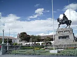 The Plaza de Armas is surrounded by the Cuzco, Portal Constitución, Portal Independencia, and the Portal Municipalidad avenues. It is surrounded by buildings which mostly date from the 16th and 17th centuries. It is Peru's largest square and monuments of great historical and architectural value. It has a level of harmony that unites all its components and it is made in the style of the plazas of Spain, such as the ones in Mérida and Trujillo. The buildings surrounding the square are works of Baroque architecture, with stone arches and red clay roofs. It is the only plaza in Peru with portals of columns and stone arches on all four sides.[1] The east side has 16 arcs or archos (Spanish: arcos). The south side has 32, the west side has 30, and the north has 33. On the perimeter of the square are houses made of white stone, which serve as headquarters for major institutions such as the Municipality, the Cathedral, the Prefecture, the Superior Court, and San Cristóbal of Huamanga University. The monument that stands in the center of the square was erected in honor of the Gran Mariscal de Ayacucho Antonio José de Sucre, which is surrounded by the coats of arms of the Bolivarian countries. In the 1990s, it was remodeled with the addition of two water sources on the east and west sides.