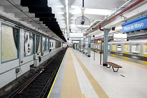 Plaza de Mayo is a station on Line A of the Buenos Aires Underground.[1] This station belonged to the first section of line opened on 1 December 1913, linking the station with the station of Plaza Miserere.[2]