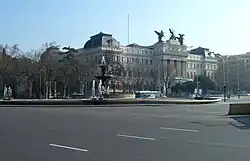 ![]() Plaza del Emperador Carlos V, with the Fuente de la Alcachofa in the foreground and the Ministry of Agriculture in the background | |