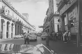 The district has two paifang,[24] the larger one located on Calle Dragones. The long-neglected Chinatown in Havana, Cuba, received materials for its paifang from the People's Republic of China as part of the Chinatown's gradual renaissance. China donated the materials in the late 1990s.[25] It has a well defined written welcoming sign in Chinese and Spanish. The smaller arch is located on Zanja strip. Cuba's Chinese boom ended when Fidel Castro's 1959 revolution seized private businesses, sending tens of thousands of business-minded Chinese fleeing, mainly to the United States. Descendants are now making efforts to preserve and revive the culture.[10] Many of the businesses in the Plaza del Vapor were operated and owned by Chinese Cubans.
