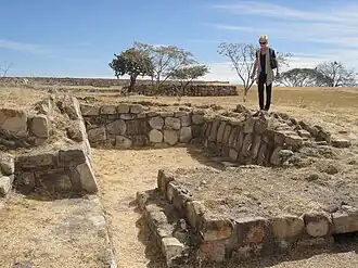 A circular formation with a 48-meter (157-foot) diameter is located some 624 meters (2,047 feet) east of the Casas Tapadas complex, over the eastern ravine,[1] previously believed to be somehow part of the Circular Building Tradition of Teuchitlán, Jalisco[11] on the Guachimontones three pyramidal basements conforming an open plaza and subtle terraces.[3] However, research on the ground proved that this structure was actually a pile of rocks and debris created more recently by farming equipment, which is corroborated by the structure's presence on a contemporary farm.