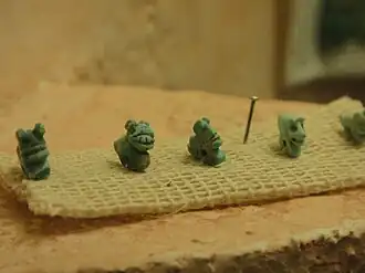 It was a high valued stone for jewels manufacturing, it was associated with water and the morning sky. Many pieces were found with various designs, among them are miniature figures (measuring about 3 mm or 1/8 of an inch), shaped as water droplets, lightning and dogs, animals associated with water.