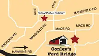 The church and cemetery are located on Mansfield Rd. 2.8 miles East of Mansfield, IN. 47872. Pleasant Valley Cemetery adjoins the church lot. It is difficult to locate this attraction, because many or the road names have been changed many times over the years and Mansfield Road is now called Country Road 37 (CR-37) on many mapping programs or GPS systems. It is also called East 700 South on some maps.