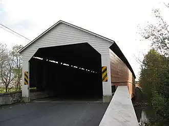 Pleasantville Bridge is a historic wooden covered bridge located at Oley Township in Berks County, Pennsylvania. It is a 126-foot-long (38 m), Burr Truss bridge, constructed between 1852 and 1856. It was built in two stages due to wood shortages after the Great Flood of 1850. It crosses the Manatawny Creek. It is one of five covered bridges remaining in Berks County.[2]