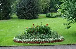 The German pleasureground was an ornately designed garden area. It consisted of an ornamental lawn at several levels immediately next to the house. This lawn required a lot of maintenance, because the aim was to make the lawn appear like a "velvet carpet". The ornamentation included native and exotic plants that were laid out as flower carpets in various, mostly geometric, shapes and, according to Repton's advice, placed tastefully in the lawn, with round or oval flower baskets hanging mostly near the paths, as well as special individual shrubs and trees, statues, water features, small ponds or garden buildings. A fence separating the pleasure ground from the rest of the park area was intended, on the one hand, to make the separation between the idealized nature of the English landscape garden and the artistic design of the ornamental garden visible. On the other hand, the enclosure was made for pragmatic reasons, in order to keep grazing cattle or wild animals away from the ornamental garden. Around the outside of the pleasure ground, and sometimes partly through it, a winding system of paths – belt walks – led through an area formed by gentle hillocks with groups of shrubs and trees to various viewing points. These could be experienced at places along the walks and offer views of buildings and the surrounding landscape, which is set out as a backdrop.