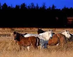 - Yakutian horse (a domestic breed of horse):[73] The first species to be introduced for the project, they were imported from the surrounding Srednekolymsk region beginning in 1988.[73] Yakutian horses have developed a range of remarkable morphologic, metabolic and physiologic adaptions to the harsh environment of Siberia, including an extremely dense and long winter coat, a compact build, a metabolism adjusted to seasonal needs, and an increased production of antifreezing compounds.[74][75] In summer they grow very large hooves, which they wear down in winter scraping away snow to get at food. Despite their size, they proved to be dominant over the wisents, who often fled from them. Yakutian horses are purely grazing animals – they eat only grass species and visit the park's forests only during the spring flood. In the spring of 2015, ten more Yakutian horses were acquired to increase genetic diversity.[76] (Numbers in park in November 2021: approximately 40)[77]