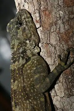 The male of Plica plica can exceed 17 cm (6.7 in) snout-vent length (SVL), the female 15 cm (5.9 in).[3] The body is flattened in shape, likely an adaptation to sticking to vertical tree trunks.[7] It has bunches of spines on its neck. It is mostly olive green or greenish in color with dark brown mottling or banding. The chin is whitish, the throat is black, and there is a black "collar" around its neck.[10] It is "mint-chocolate-chip-colored,"[11] a color tone that helps it blend into mossy tree bark.[5]