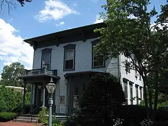 The Plimpton–Winter House is a historic house in Wrentham, Massachusetts. This two-story wood-frame house, built in 1868, is Wrentham's finest Italianate house. It has the boxy shape and low hip roof with bracketed eave, elements that are typical of the style, along with a front entry porch with bracketed cornice and balustrade above. Its first owner, Francis Plimpton, was president of the First National Bank of Wrentham for forty years, and its second owner, Murray Winter, was co-owner of a local factory.[2]