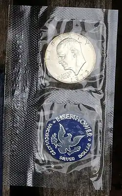 Pliofilm manufacture was hindered by the Japanese occupation of rubber-producing countries in Southeast Asia.[22] Commercial outputs were stopped and the entire production given over to military uses, leading to a large commercial demand and a backlog of orders after the war's end.[23][24] In the post-war years Pliofilm saw use as a food wrap, to package drugs and textiles, and as a means of laminating paper.[11][25] It was also marketed as Vitafilm.[25] Production was extended abroad to the Goodyear factory in Wolverhampton, England, in the late 1940s.[26] The United States Mint switched its packaging for mint set coins from Cellophane to Pliofilm in 1955.[27] The American Chemical Society awarded Harold J. Osterhof the 1971 Charles Goodyear Medal for inventing Pliofilm.[10] It remained commercially available until at least 1987.[4]