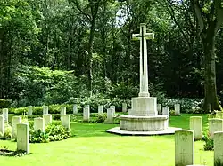There are numerous Commonwealth War Graves Commission (CWGC) cemeteries and memorials around the wood, including the Ploegsteert Wood Military Cemetery (with 163 identified casualties)[2] as well nearby the Hyde Park Corner (Royal Berks) CWGC Cemetery and the Berks CWGC Cemetery Extension with the Ploegsteert Memorial to the Missing.[3] The Ploegsteert Memorial commemorates more than 11,000 British and Empire servicemen who died during the First World War and have no known grave. It is one of several CWGC Memorials to the Missing along the Western Front. Those lost within the Ypres Salient without a known grave are commemorated at the Menin Gate and Tyne Cot Memorial to the Missing, while the missing of New Zealand and Newfoundland are honoured on separate memorials.