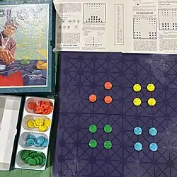It was invented by Frank Thibault and commercially released by 3M Company in 1970, as part of the 3M bookshelf game series. The game set includes a board and 48 pieces of various colors and markings along with instructions and a plastic tray to sort the pieces.[1] The game is marketed as a "space-age strategy game". 3M no longer produces the game, but Ploy has been adapted for play on Vassal, Zillions of Games or via a ploy program.