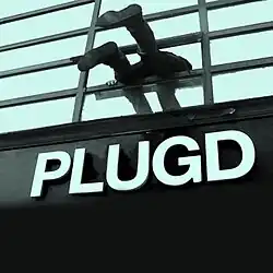 ![]() Current logo of Plugd Records, depicting proprietor Jim Horgan entering its former Washington Street location in Cork, Ireland via an upstairs window. | |