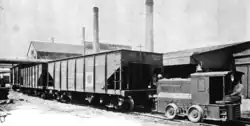 Plymouth locomotives were first built in 1910 by the J. D. Fate Company, which became Fate-Root-Heath in 1919.[2] The J.D. Fate patent application filed in 1917 shows the engine driving a clutch and a continuously variable transmission that allowed varying the speed through zero to reverse the locomotive. The output of the transmission drove a transverse jackshaft through a chain drive, with additional drive chains to the two driving axles.[3] All early Plymouth locomotives used this drive scheme.[4] The Fate-Root-Heath patent application filed in 1925 shows a far more conventional 4-speed transmission and reverse gears driving the jackshaft and final chain drive to the 2 driving axles.[5]