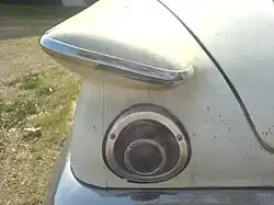 The Valiant was less radical in configuration than General Motors' compact Chevrolet Corvair, which had an air-cooled rear-mounted engine, but was considered more aesthetically daring than the also-new Falcon and Studebaker Lark compacts, which had more conventional looks; the Valiant boasted a radical design that continued Exner's "Forward Look" styling with "sleek, crisp lines which flow forward in a dart or wedge shape".[7] The flush-sided appearance was a carried-over feature from Chrysler's Ghia-built D'Elegance and Adventure concept cars which also gave the Valiant additional inches of interior room.[7] The Valiant's styling was new, yet with specific design elements that tied it to other contemporary Chrysler products, such as the canted tailfins tipped with cat's-eye shaped tail lamps and the simulated Continental spare tire pressed into the trunk lid that were thematically similar to those on the Imperial and the 300F. According to Exner, the stamped wheel design was used not only to establish identity with other Chryslers, but to "dress up the rear deck area without detracting from the look of directed forward motion".[7]