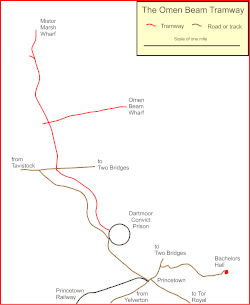 The Omen Beam Tramway was an independent tramway for the gathering of peat from the moor above Dartmoor prison, for the manufacturing of naphtha.