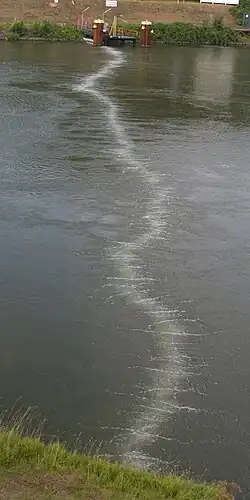 A pneumatic barrier is a method to contain oil spills. It is also called a bubble curtain. Air bubbling through a perforated pipe causes an upward water flow that slows the spread of oil. It can also be used to stop fish from entering polluted water. A further application of the pneumatic barrier is to decrease the salt-water exchange in navigation locks and prevent salt intrusion in rivers. .[1] Pneumatic barriers are also known as air curtains. The pneumatic barrier is a (non-patented) invention of the Dutch engineer Johan van Veen from around 1940 .[2]