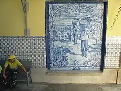 The passenger building is located on the south side of the tracks. It contains a number of azulejos, tin glazed ceramic tiles produced by Gilberto Renda[10] and J. Oliveira, showing scenes of daily life in the surrounding region.[11]