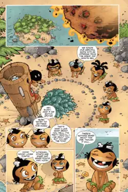 At the beginning of this comic, Klik is visited in a dream by an owl god who tells him that Sun holds clues to the fate of the tribe. He wakes up and goes to find Sun, who has been kept as a prisoner in a makeshift bamboo cell. However, Nooby, who finds Sun attractive, takes her out to watch the sun rise with him, essentially "watching the sun while watching Sun". He also made her a decorated leg bone for her hair. When Ooga finds the two on the beach and scolds Nooby, Sun lies that she tricked Nooby into taking her out so that Nooby would not be blamed. Klik arrives at the scene and declares that all previous events were results of misconceptions, and that they should be helping Sun instead of holding her captive. At a tribe meeting, she informs the boys that her tribe's Jewel of Life had been stolen by Newbie and that the members had split up, following different techniques in hopes of finding it. Though Ooga is against the idea, feeling that Sun is leading them on, Klik insists that they bring Sun back home, believing that it wound answer and create questions about their existence. As they set out, Sun discloses that as she was following Newbie, she passed a seemingly bare and tiny island that Newbie disappeared onto. As they approach this island, they are immediately attacked by an enormous octopus, whose likeness is represented by a small statue on the island. As it captures them and begins to consume the pygmies, Klik reveals that he brought along the Gem, which outrages Ooga. At the last minute, the Tyrannosaurus rex "Chicken" in his zombie form resurfaces from under the ocean and attacks the octopus, allowing the pygmies an escape. Ooga reprimands Klik for bringing along the Gem, claiming that it was irresponsible and that he had led them on a pointless mission. He gives Nooby the gem, explaining that even Nooby couldn't be any more careless with it. As Ooga and Klik continue to argue, Nooby jams the gem into a hole in the statue, uncovering a secret passageway below the ground. Sun speculates that Newbie used the girl's Jewel to unlock the door and escape, and they all descend into the chamber. They find themselves in a cavern full of glowing plants, but at what appears to be a dead end, as the only other exit is through a diving pool. However, Nooby's curiosity proves to be productive again; he takes one of the plants and puts it over his head. Klik examines the plant, discovering that it adheres to the head and exudes oxygen. Taking advantage of this knowledge, they use the plants as a sort of scuba gear and continue their journey into the water. As they pass through large caves with mysterious carvings, they find an opening through which they see a large temple in the distance. Sun is convinced that this is the next step of their journey.