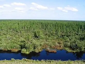 Two notable wildfires have burned within the Pocosin Lakes NWR since its protection. In April 1985, the Allen Road Fire ignited in the refuge, burning nearly 100,000 acres over three weeks and requiring assistance from the Marines to extinguish the peat 'ground fires' it left in its wake.[5] On June 1, 2008, lightning struck the refuge and started a wildfire known as the Evans Road Fire that had, as of 17 September 2008, spread to about 40,704 acres (164.72 km2), and burned much of the same land before it was completely contained.[6] [7] The fire was declared out on January 9, 2009.[8]