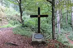 Graves two through four lie in the Svetel Woods (Slovene: Svetelov gozd) along a path on the south slope of Golaš Hill, facing Dobrava Hill. Grave two is east of a water catchment installation, grave three on the slope of a sinkhole, and grave four at the top of a small rise. They contain the remains of murdered Ustaša officers from the prisoner of war camp in Kamnik.[5][6][7] The graves are also known as the Svetel Woods Postwar Victims Grave (Slovene: Grobišče povojnih žrtev v Svetelovem gozdu). They are marked by a metal cross and a bronze memorial plaque mounted on a concrete base, arranged by the Municipality of Kamnik in 1994.[8]