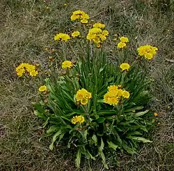 The species has a thick, upright single stem and reaches up to 60 cm in height, with yellow inflorescences that are around 25 mm in diameter. These appear in summer.[2] Spathulate basal leaves clasp the stem and are up to 20 cm in length.[2] Leaves on the stem above these are smaller and decrease in size with height.[3]