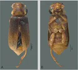 They are entirely yellow orange, except for the black antennae and the apex of mandibles (which is brown). Furthermore, the elytral basal thirds is iridescent brown.[1]