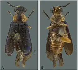 Adults reach a length of about 6.4–7.1 mm. The head and antennae are black, while the mandibles, labium, maxilla, thorax and abdomen are orange. The pronotal disc is brown and the elytra is iridescent, varying from blue to green.[1]