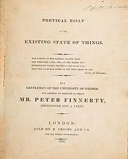 "Poetical Essay on the Existing State of Things" is an essay by Percy Bysshe Shelley published in 1811. The work was lost since its first appearance until a copy was found in 2006 and made available by the Bodleian Library in 2015. The anti-war and anti-imperialist work was intended to raise money for the radical Irish journalist Peter Finnerty, who had been imprisoned for libeling the Anglo-Irish politician Robert Stewart, Viscount Castlereagh, whom he accused of mistreating United Irish prisoners.[1] The work is a precursor to The Masque of Anarchy and "England in 1819".