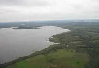 The lake is polymictic with a round shape and a depth which does not have substantial difference. The lake's area is 670.8 ha (1,658 acres), with a maximum depth of 2.6 metres (8 feet 6 inches).[1] In the Northern part of the lake is located the island Ostrów Wielki with an area of 21 ha (52 acres).[4] The lake is mainly surrounded by forests (about 95%, the rest 5% are fields and pastures). The shore of the lake is a swamp, and is not easily accessible. The surface of the lake is covered with vegetation from the water. The main inflow of the lake is the river Rybnica, which carries water from the lake Brzozolasek. The outflow of the lake is also by the river Rybnica in the South which flows the water to the nearby lake Pogubie Małe. From the Western side of the lake the river Zimna flows in.[2]