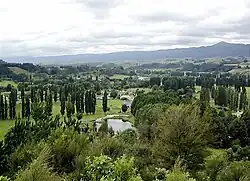 Pohangina is located along the foot of the Ruahine Range, and is primarily farming land. Farming varies from sheep and cattle to crops of maize and 'chow'. The farmland was originally ancient native forest.[3][4] Rimu and northern rātā grew above 1000 feet, with kāmahi, kaikawaka and pink pine growing at higher and steeper slopes, leatherwood scrub growing at higher altitudes, and wild tussocks growing at the summits of the range.[5]
