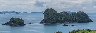 ![]() Poikeke Island seen from the Coromandel Peninsula, to the left of Motueka Island (Pigeon Island) | |