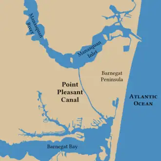 Point Pleasant was incorporated as a borough by an act of the New Jersey Legislature on April 21, 1920, from portions of Brick Township, based on the results of a referendum held on May 19, 1920. The borough was reincorporated on March 12, 1928.[25] Point Pleasant is distinct from Point Pleasant Beach, which is a separate community.[26] The borough gets its name from Point Pleasant Beach, which gets its name from its location at the northern end of the Barnegat Peninsula, a long, narrow barrier peninsula that divides the Barnegat Bay from the Atlantic Ocean at the Manasquan Inlet.[24]