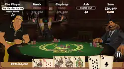 The four additional characters in addition to the player are Sam from the Sam & Max franchise (voiced by David Nowlin), who is assisted by Max (voiced by David Boat), Brock Samson from The Venture Bros. (voiced by Patrick Warburton), Ash Williams from The Evil Dead franchise (voiced by Danny Webber), and Claptrap from the Borderlands series (voiced by David Eddings). GLaDOS (voiced by Ellen McLain) from the Portal series takes a supporting role as the dealer. During the hands, these characters provide humorous chatter between each other and towards the player. Reginald Van Winslow (voiced by Roger L. Jackson) from Tales of Monkey Island reprises his role as the host.[1][6] Additional brief cameos include Steve the Bandit (voiced by Mikey Neumann) and Mad Moxxi from Borderlands, Doug and a Save-Lot Bandit from The Walking Dead, General Skun-ka'pe (Roger Jackson) from Sam & Max: The Devil's Playhouse, and a waiter from Gravity Bone.