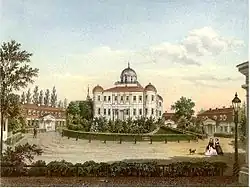 It was established in 1748 as a hunting lodge by Duke Charles Christian Erdmann, a scion of the House of Württemberg, whose ancestors had been enfeoffed with the Silesian Duchy of Oels (Oleśnica) in 1649. The adjacent settlement erected in 1763 with its streets radiating out from the ducal palace was modeled on and named after the Baden residence of Karlsruhe. The Polish name of the village was Pokój.[3] When the Oels fiefdom fell to the Dukes of Brunswick-Wolfenbüttel in 1792, Charles Christian Erdmann's cousin Duke Eugen of Württemberg retained the town and palace of Carlsruhe as a fee tail. In the winter of 1806-07, he hosted the young composer Carl Maria von Weber, who wrote his two symphonies (Jähns 50/51) here. In 1842, the village had a population of 2,069.[3] In the mid-19th century, the residents spoke mostly Polish and German.[4] In 1847 Carlsruhe received the status of a spa town (Bad).