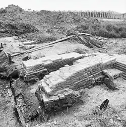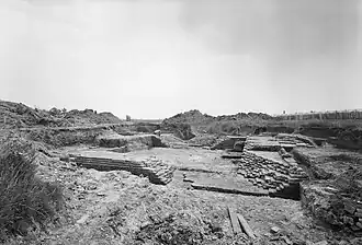 In 1936 some artefacts were found near Monster, amongst these a sarcophagus, and many bricks. Historians immediately connected these to Polanen Castle.[23] In late March 1940 Archeologist Jaap Renaud succeeded in borrowing some mobilized soldiers from Captain Roorda van Eysinga, so he could do a preliminary investigation. Some digging then uncovered part of the walls of Castle Polanen.[24] In 1942 Renaud published the results.[25]