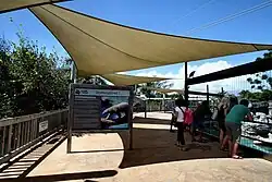 The main public exhibit features three viewing areas: underwater, water-level and above-water. An array of educational signs are located in the viewing areas and along the paths between them. A large salt water pool encompasses much of the area with depths of between 1 and 4 metres (3 ft 3 in and 13 ft 1 in). Smaller fresh water pools also exist. A rocky environment fills the rest of the exhibit. A sprinkler system allows the simulation of rain in the covered exhibit. Five large fans, similar to those used in the production of movies, allows the wind speed to be regulated. Mist is used to reduce the air temperature.[3]