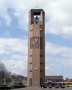 The Poldertoren is a water tower at the town center of Emmeloord, Netherlands. The Dutch name Poldertoren could be translated as Polder Tower. The 65-meter tower was built in 1959 and has a large carillon. The tower is no longer in use as a water tower. The owner of the tower was the water company, Vitens, but since 2005 the municipality of Noordoostpolder has owned the tower.