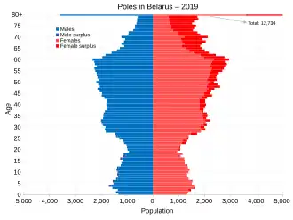 The Polish minority in Belarus (Polish: Polacy na Białorusi; Belarusian: Палякі ў Беларусі, romanized: Paliaki w Bielarusi) numbers officially 287,693 according to 2019 census.[1] However, according to the Ministry of Foreign Affairs of Poland the number is as high as 1,100,000.[3] It forms the second largest ethnic minority in the country after the Russians, at around 3.1% of the total population according to the official census. According to the official census, an estimated 205,200 Belarusian Poles live in large agglomerations and 82,493 in smaller settlements, with the number of women exceeding the number of men by 33,905.[1] Some estimates by Polish non-governmental sources in the U.S. are higher, citing the previous poll held in 1989 under the Soviet authorities with 413,000 Poles recorded[2] and the census of 1959 with 538,881 Poles recorded in Belarus.