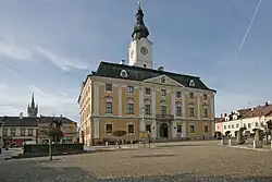 The historic centre is formed by Palackého Square and adjacentr streets. The square includes one of the most notable Baroque town halls in the country. It replaced an old Gothic town hall and was built in 1739–1744. The baroque 22-metre (72 ft) high Marian column was built in 1727–1731. Both the town hall and the Marian column were probably designed by the architect František Maxmilián Kaňka.[11][12]