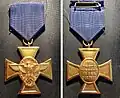The silver eighteen-year service cross was the second class award. The design was a silver-gray four-pointed cross (Ordenskreuz) measuring 43 millimetres (1.7 in) suspended from a cornflower blue ribbon with a woven police insignia. The ribbon varied in width; some were 37 millimetres (1.5 in) and others measured 51 millimetres (2.0 in). The obverse of the medal bore the police insignia of a national eagle emblem surrounded by a wreath. The reverse side was inscribed with Für treue Dienste in der Polizei in raised lettering.[2]
