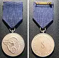 The eight-year service award was the third class silver medal. It was a round medal measuring 38 millimetres (1.5 in) suspended from a 35-millimetre (1.4 in) wide cornflower blue ribbon. The front side had the police insignia; the reverse side had a number 8 surrounded by the inscription Für treue Dienste in der Polizei in raised lettering.[1]