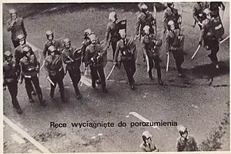 During the 2014 Hong Kong protests, there were numerous instances of police brutality. Seven police officers were caught on video kicking and beating a prominent political activist who was already handcuffed.[14] There had also been more than hundreds of incidents of police beating passers-by with batons. Pictures on local TV and social media show demonstrators being dragged behind police lines, circled by police officers so that onlookers' views were blocked, and in some cases, re-emerging with visible injuries. An officer-involved, retired police officer Frankly Chu King-wai was sentenced to three months in prison for causing serious bodily harm.[15][16]