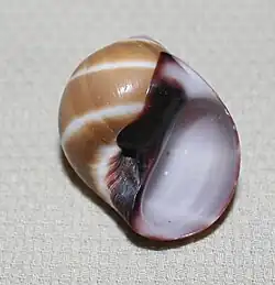 The shell is smooth. The exterior is tan or light brown with two widely-separated, narrow white bands. There are about four whorls and a low spire. The shell has a large aperture. The shell is a darker brown at the inside edge of the aperture. The interior is white. The shell reaches a height of 40 mm (1.6 inches) and a diameter of 26 mm (1 inch). The operculum is brown.[3][4]