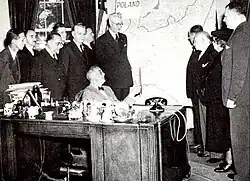 In 1944, Franklin D. Roosevelt assured Polish-American leaders that he would work for a strong and independent Poland, meeting with the Polish-American Congress and gaining key endorsements. FDR posed with Polish-American leaders in front of a large map of prewar Poland, creating imagery of an expanded Poland free from encroaching Soviet occupation. He made a pledge to uphold the Atlantic Charter relating to Poland in Chicago one week before the presidential elections. FDR won over 90% of the Polish-American vote, but gave in to Stalin's demands after World War II. In private conversations, FDR told Stalin that he was willing to give the USSR Poland's eastern region while taking land it lost to Germany, moving it westward. However, he indicated that he needed Polish votes to win his re-election and would not want to have his intentions with Stalin known because they were clear violations of his campaign promises.[19][20] FDR kept his promises to Stalin so secretive that even his successor, Harry Truman, was never informed of them. In Truman's first days in office, he called in the Russian foreign minister and dealt with him harshly, saying that Russia's new communist-imposed rule on Poland was a violation of its obligations and authorities under World War II agreements, and that it had exceeded its welcome after entering Poland to fight Nazi Germany. Truman later learned the extent of FDR's cooperation with Stalin and gave in, recognizing the Soviet-occupied regime as the legitimate Polish government.[21] During the Truman administration, U.S. Ambassador to Poland Arthur Bliss Lane resigned in protest after witnessing fixed elections in Poland. He spoke at a rally in May 1947, gathering 50,000 Polish-Americans who heard him denounce the U.S. appeasement policy towards the U.S.S.R.[22]