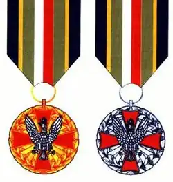 The medal is either gold, silver, or bronze, depending on the grade, 36 mm in diameter. On the obverse is a red enameled cross pattée with concave arm bases. Between the arms of the cross are stylized rays. Under the arms of the cross is a laurel wreath. Superimposed on the cross is a silver crowned eagle for all grades. The reverse is plain aside for a two line inscription "WOJSKO POLSKIE" (Polish Army). The medal is suspended from a ribbon 38 mm wide. The colors are light brown with blue edges, separated by yellow pinstripes. In the center is a half white and half red stripe.[3] On the ribbon bar a gold vertical bar is worn in the center for the gold medal and a silver vertical bar is worn in the center for the silver medal. The ribbon bar of the bronze medal is unadorned.